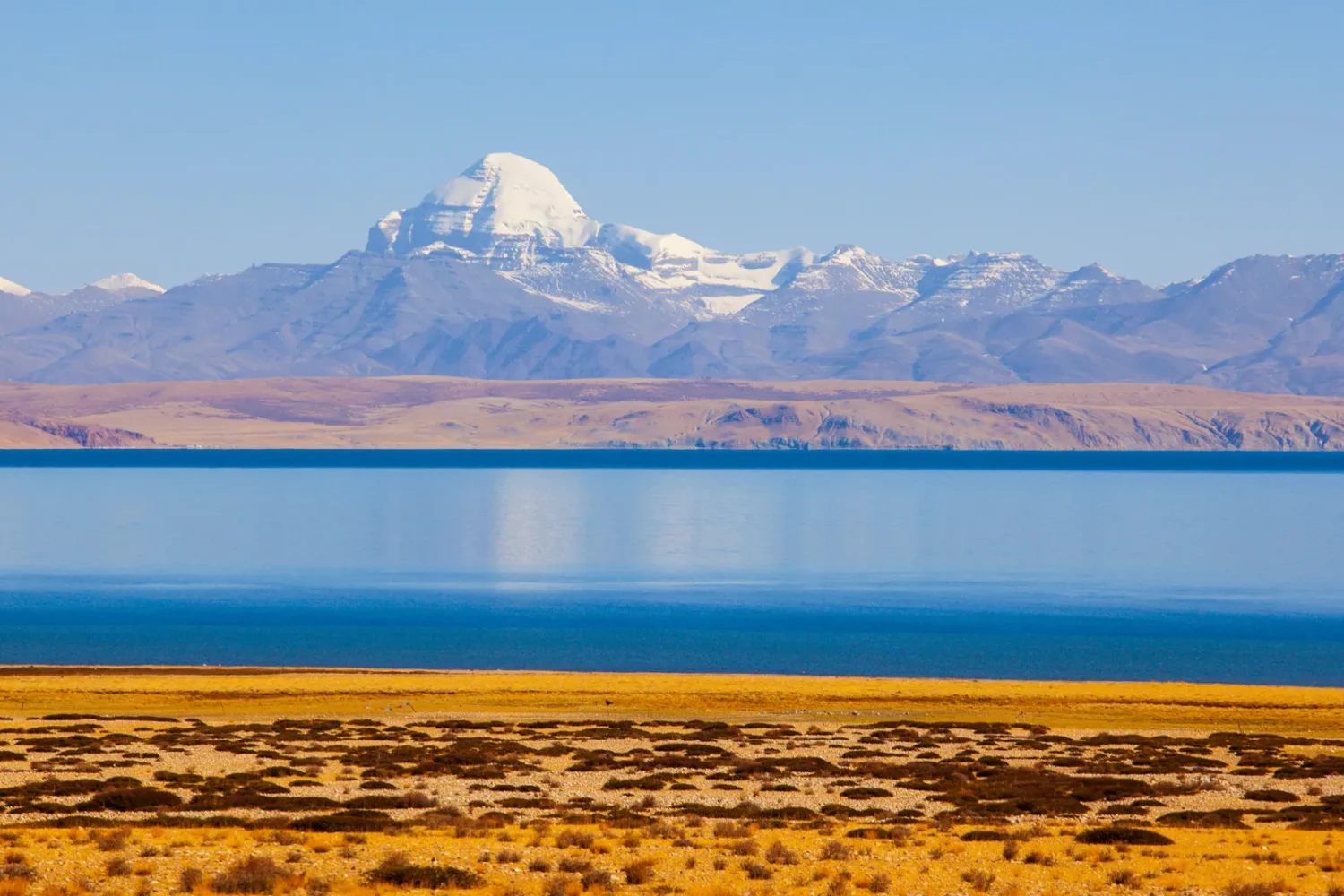 • Manasarover LakeLake Manasarover is a high-altitude, pure, blue freshwater lake near Mt. Kailash in Burang County, Ngari Prefecture, Tibet Autonomous Region, China. With an elevation of 4,600 m, it is located near the western trijunction between Nepal, China, and India. It has a maximum depth of 100 m (330 ft) and covers a 410 km² area. It is locally known as Mapam Yumtso. According to Hindu mythology, it is believed that the turquoise lake was first formed in the mind of Lord Brahma, where later Lord Shiva and Lord Brahma appeared here as swans. The holy water of the lake is believed to have the power of washing away people's sins. So, many people take a bath and then do pooja of Lord Shiva in the nearby temple.